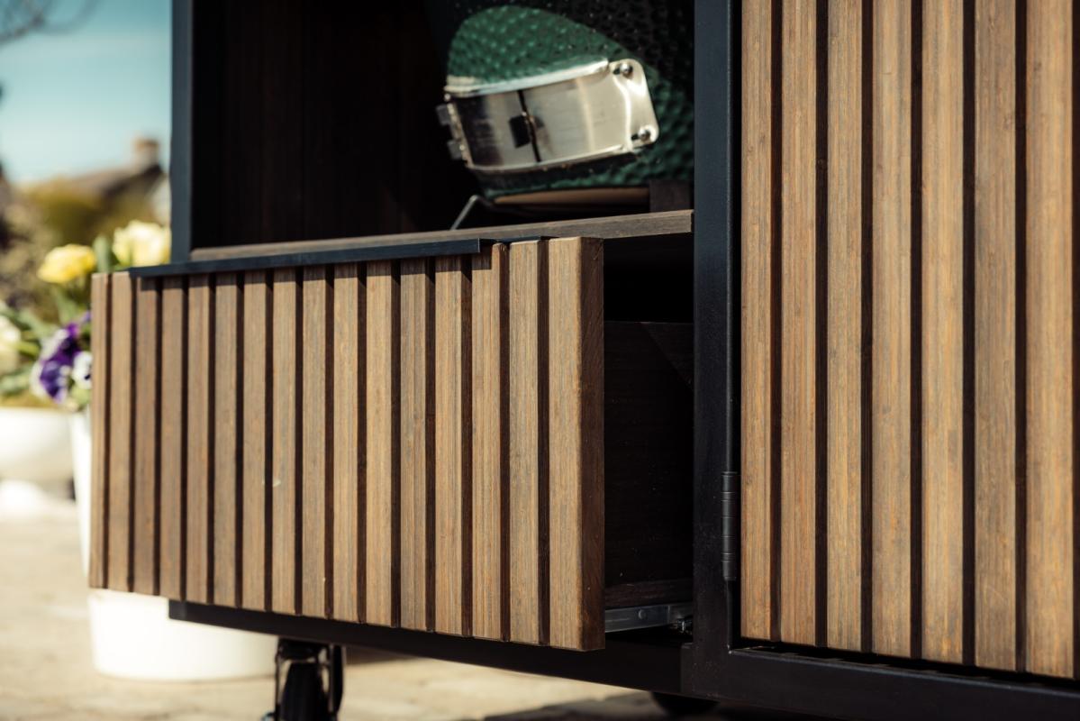 Deze uitvoering biedt voldoende werkruimte en opbergruimte, zonder veel plaats in te nemen. Perfect voor kleinere terrassen of patio’s waar efficiëntie en stijl samenkomen.